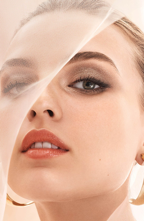 For a Sparkling Stunner look: Begin by sweeping Lamé all over with an eye sweep brush. Blend Rose-Suede into the creases with an angled eyeshadow brush, then diffuse Vintage Velvet across the upper lashlines and creases with the same brush. Smudge Earth Metal along the lower lashlines with a smoky eyeliner brush. Apply Damask Ball at the inner corners with an angled eyeshadow brush. Finish with eyeliner and mascara.