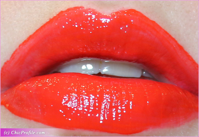 It’s a bright and intense shade and didn’t emphasize my lip lines. Is the kind of color that will instantly warm your face and attract attention to your lips. Definitely not for those who are color shy. 🙂