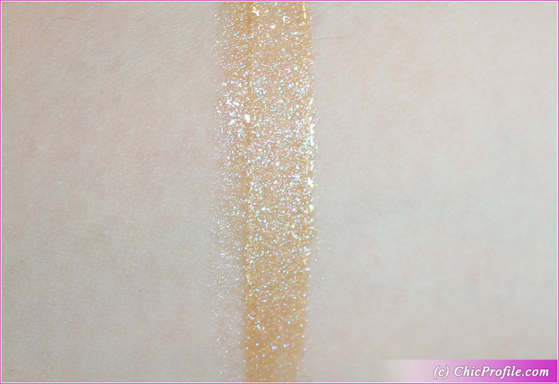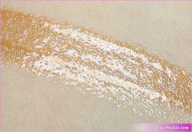 MAC Twerk for Gifts Dazzleglass ($20.00 / £15.50 for 0.06 oz./ 1.92 g) is a medium peach gold with warm undertones and multi-colored fine sparkle, gold pearl finish. It delivers a semi-sheer coverage in a single layer. It ads a fair amount of color to the lips but still gives a sense of transparency. The gold pearl and shiny finish are so beautiful that you don’t even care about a full color coverage.