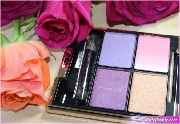 The colors come gently on the eyes with a good color payoff and easily buildable if you want more pigmentation. They adhere well on bare skin and they apply well without any fall our or creasing. It’s a really nice combination of colors for summer, or any other season. You will find two mattes within the palette and two shimmers.
